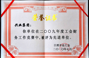 ·2010年7月,興業(yè)集團(tuán)在2009年度工會(huì)財(cái)務(wù)工作競(jìng)賽中,被日照市總工會(huì)評(píng)為先進(jìn)單位
