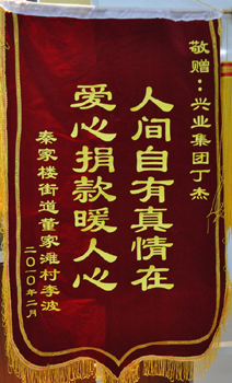 · 2010年2月,敬贈興業(yè)集團(tuán)董事長丁杰“人間自有真情在,愛心捐款暖人心”錦旗