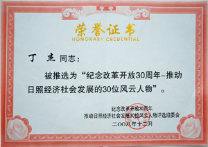 · 2008年12月,丁杰董事長被評為“紀(jì)念改革開放30周年風(fēng)云人物-推動日照社會經(jīng)濟(jì)發(fā)展的30位風(fēng)云人物”