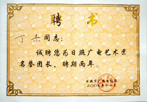 · 2007年11月,誠聘丁杰董事長為“日照廣電藝術(shù)團(tuán)名譽(yù)團(tuán)長”
