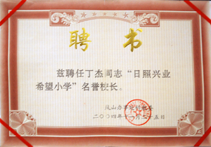 · 2004年11月,茲聘丁杰董事長為“日照希望小學(xué)榮譽(yù)校長”
